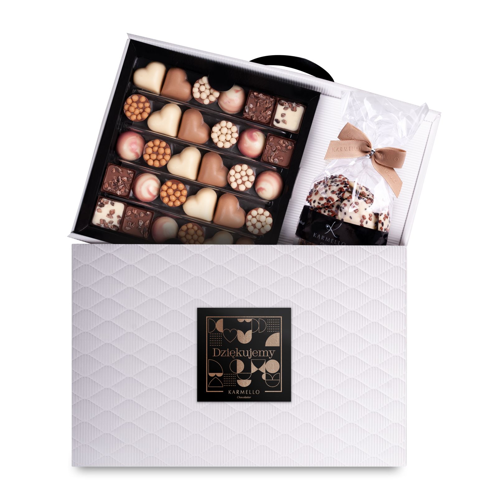 Die Kombination aus einer Komposition aus Pralinen und Studentenkeksen ist eine perfekte Geschenkidee. Das Ganze ist in einer eleganten Aktentasche verpackt, die zusätzlich mit einem Etikett mit der Aufschrift „DANKE“ verziert ist.