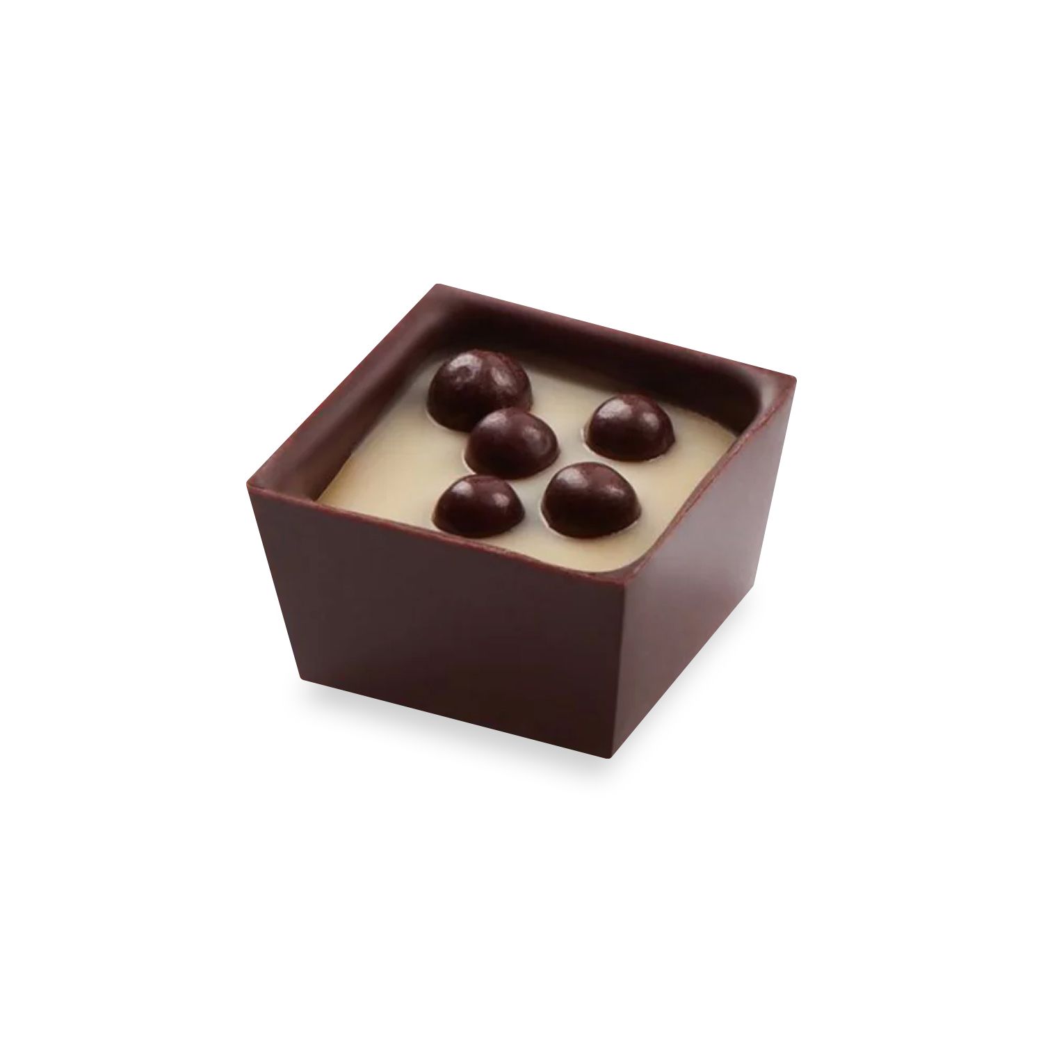Füllung aus dunkler Schokolade, angereichert mit einzigartigem Amaretto-Aroma, versteckt unter weißer Schokolade.