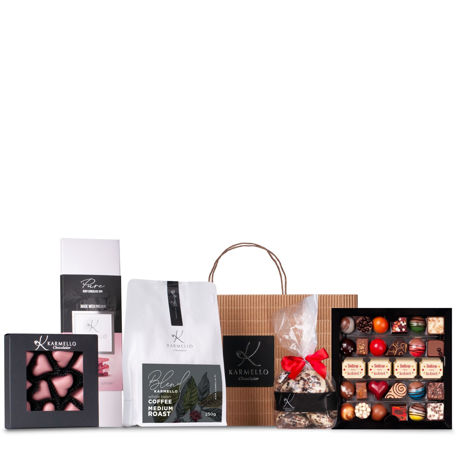 The beige gift bag contains products that will appeal to every recipient, from a set of chocolates to freshly roasted Karmello coffee beans. It will be a perfect gift for Women's Day.
