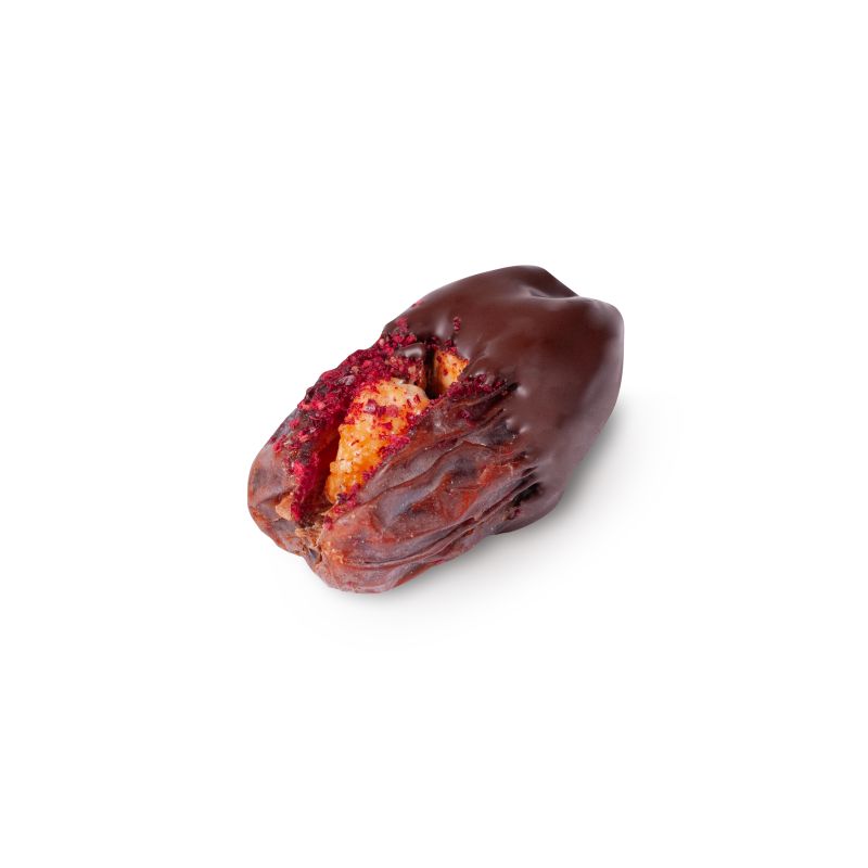 Süße, orientalische Datteln mit der Zugabe von Süß- und Sauerkirsche und zarter Mandel umhüllt von dunkler Karmello-Schokolade.