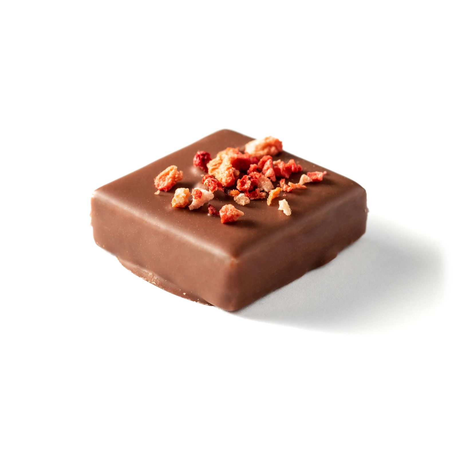 MILK CHOCOLATE PRALINE WITH MILK CHOCOLATE, STRAWBERRY PUREE AND PEANUT PASTE FILLING (74.5 %)