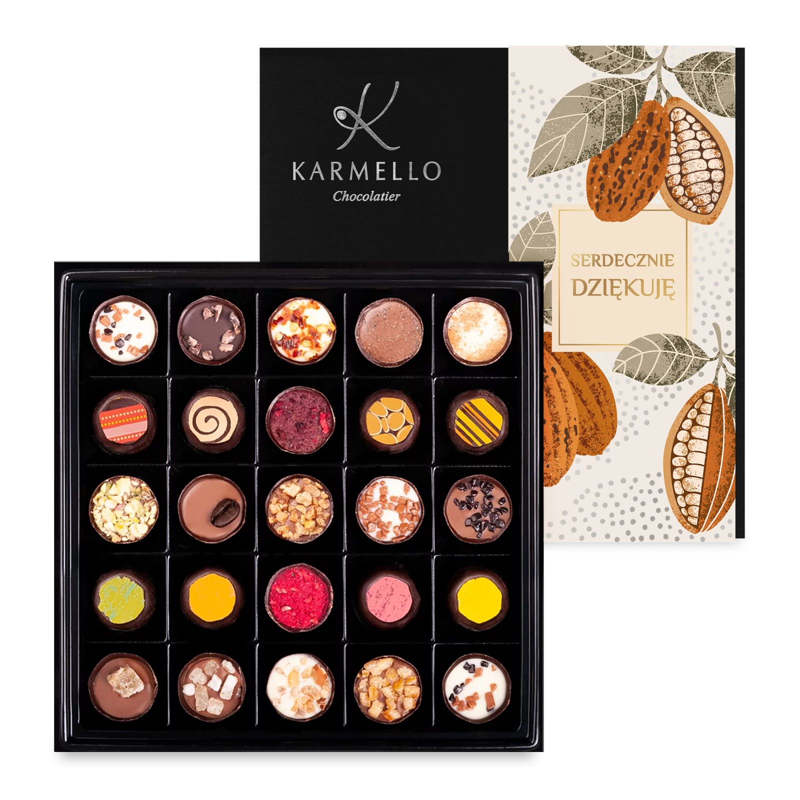 Mit größter Sorgfalt hergestellte Pralinen jetzt in Form eines eleganten Sets mit 25 Stück des Produkts. Die EXCLUSIVE MIX COLLECTION ist komponiert aus den besten verfügbaren Geschmacksrichtungen und Aromen, versteckt in hochwertigster Schokolade und mit größter Sorgfalt mit verschiedenen Zusatzstoffen dekoriert. Die Komposition eignet sich perfekt als elegantes Geschenk.