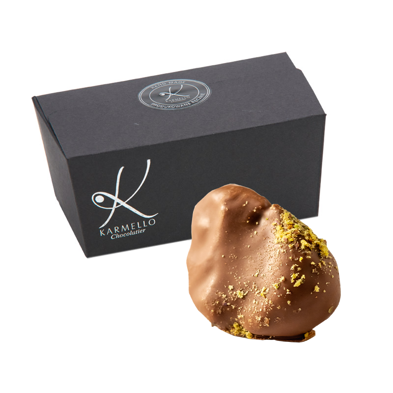 Eine Komposition aus aromatischen Nüssen, getrockneten und kandierten Früchten und zartschmelzender Vollmilchschokolade ergibt eine Füllung voller einzigartigem Geschmack, versteckt in Vollmilchschokolade und dekoriert mit zerstoßenen Pistazien.