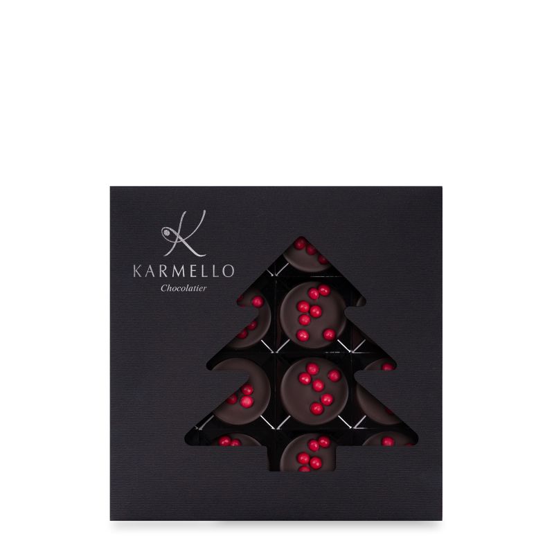 Köstliche, dunkle Schokolade bringt den Geschmack der Kirschfüllung optimal zur Geltung. Pralinen verpackt in einer Verpackung mit einem geschnittenen Weihnachtsbaum. Perfekt als Ergänzung zu Weihnachtsgeschenken oder als eigenständiges, süßes Geschenk.