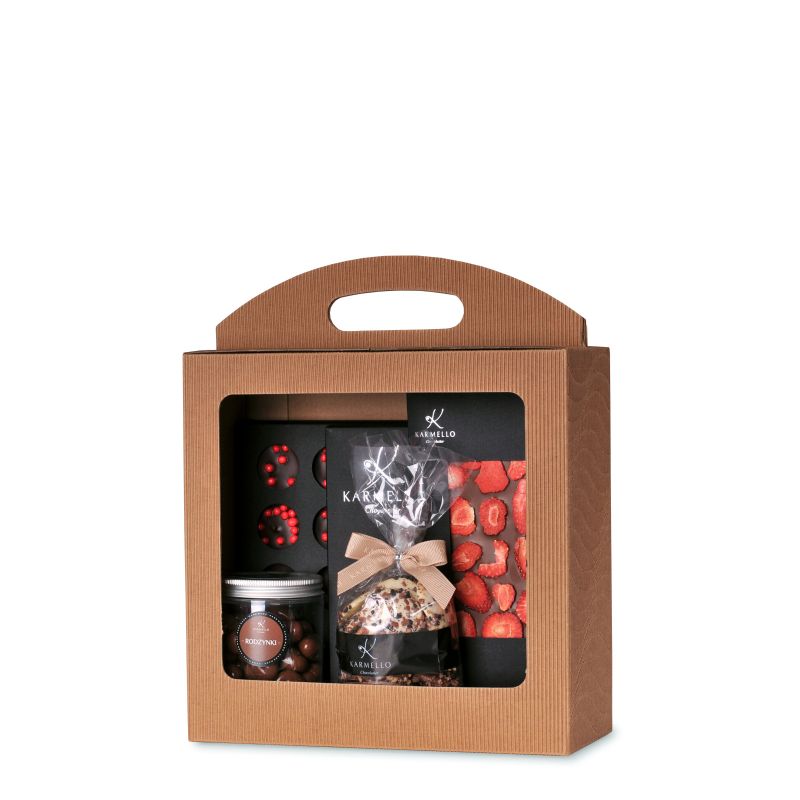 Neue Verpackung von Karmello! Die neue Form einer eleganten Verpackung, die bis zum Rand mit Süßigkeiten von Karmello gefüllt ist, ist eine perfekte Idee für ein einzigartiges und elegantes Geschenk. Die Verpackung verfügt über ein Fenster, durch das die Produkte sichtbar sind.