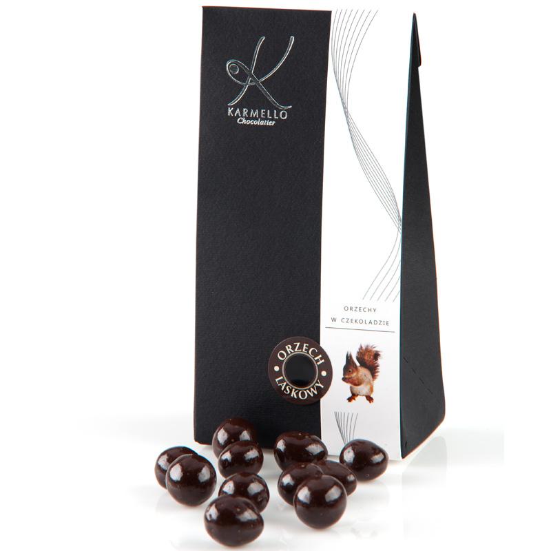 Sorgfältig ausgewählte Haselnüsse, eingewickelt in geschmacksintensive, dunkle Schokolade.