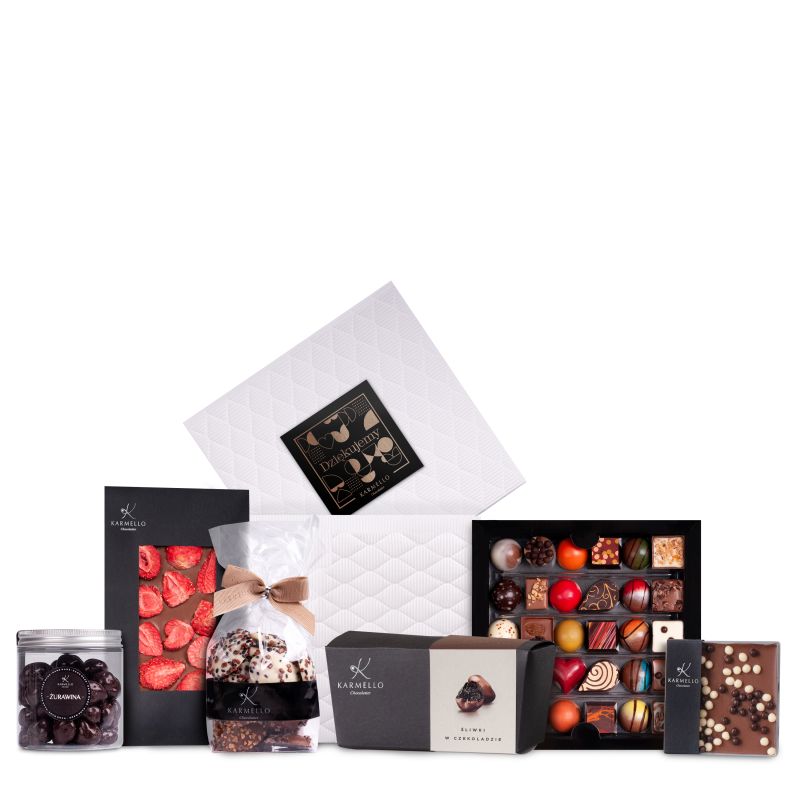Extrem klassische Linien eleganter Verpackungen, bis zum Rand gefüllt mit Schokoladenperfektion von Karmello, stellen ein Rezept für ein perfektes Hochzeitsgeschenk dar. Das Set enthält sorgfältig zusammengestellte Produkte, die einen Querschnitt unseres Angebots darstellen, der es dem Empfänger des Sets ermöglicht Begeben Sie sich auf eine süße Reise zwischen den magischen Aromen von Karmello. Die Verpackung ist zusätzlich mit einem Etikett mit der Aufschrift „DANKE“ verziert.