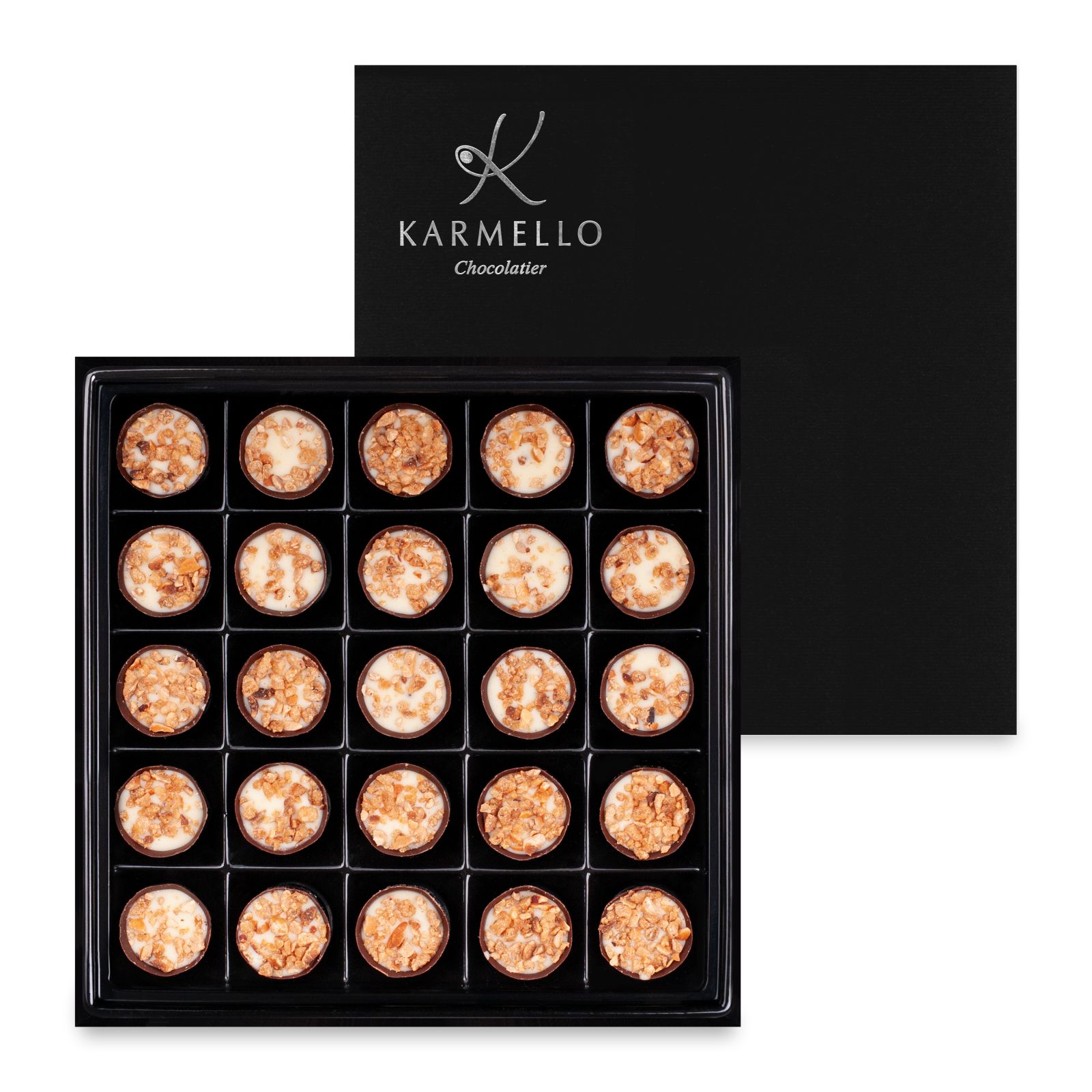Ingredients: dark chocolate (47 %) (cocoa mass; sugar; cocoa butter; emulsifier: SOYA lecithin; natural vanilla flavour); white chocolate (20 %) (sugar; cocoa butter; whole MILK powder; emulsifier: SOYA lecithin; natural vanilla flavour); CREAM; multifloral nectar honey (10 %); caramelized hazelnuts (sugar; HAZELNUTS); stabilizer: sorbitol; BUTTER; glucose syrup; crystallized inverted sugar syrup; emulsifier: glycerol. Dark chocolate: cocoa solids: 54.1 % minimum.