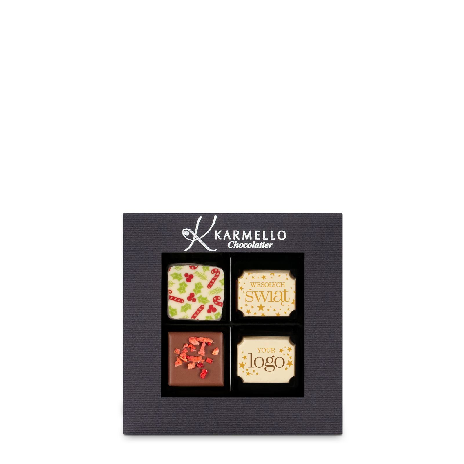 K25/21 Weihnachtskollektion mit 4 Pralinen mit Logo und Frohe Weihnachten