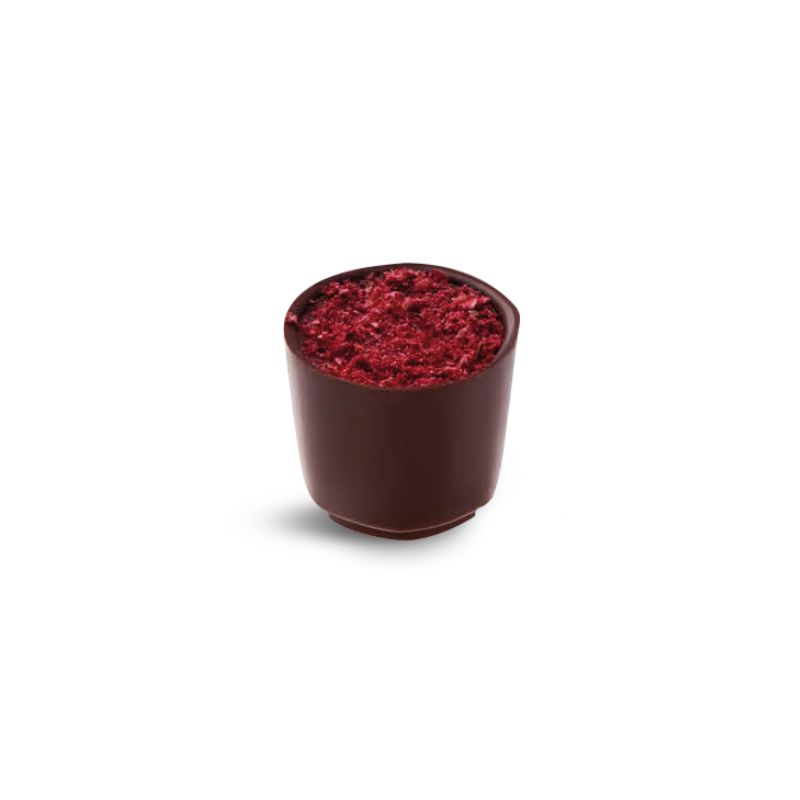 Zartes Karamell, angereichert mit Moosbeeren- und Vanille-Aromen, bildet das süße Innere der Schokolade, das sich in hochwertigster Zartbitterschokolade verbirgt. Die Aromen werden durch die zart-säuerliche gefriergetrocknete Himbeere unterstrichen, die auch als Dekoration der Schokolade perfekt ist.