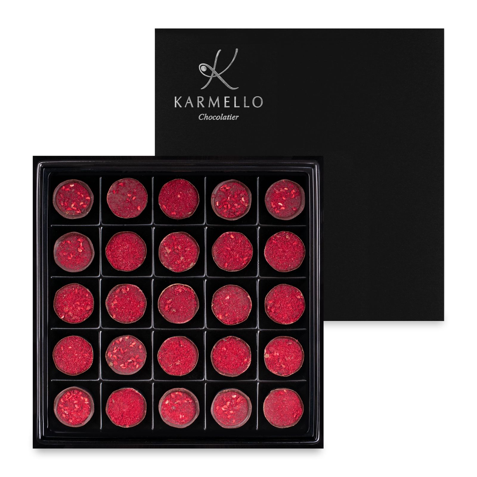 Zartes Karamell, angereichert mit Moosbeeren- und Vanille-Aromen, bildet das süße Innere der Schokolade, das sich in hochwertigster Zartbitterschokolade verbirgt. Die Aromen werden durch die zart-säuerliche gefriergetrocknete Himbeere unterstrichen, die auch als Dekoration der Schokolade perfekt ist.