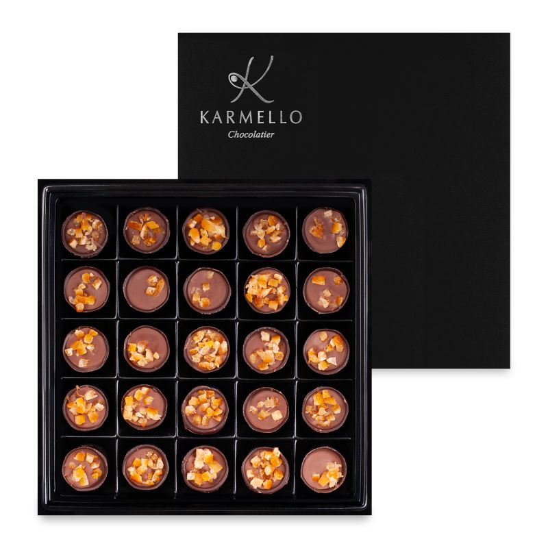 Zartes Karamell kombiniert mit einem erfrischenden Orangenaroma, umgeben von entschiedener dunkler Schokolade. Die sich perfekt ergänzenden Aromen werden durch kandierte Orangenschalen unterstrichen.