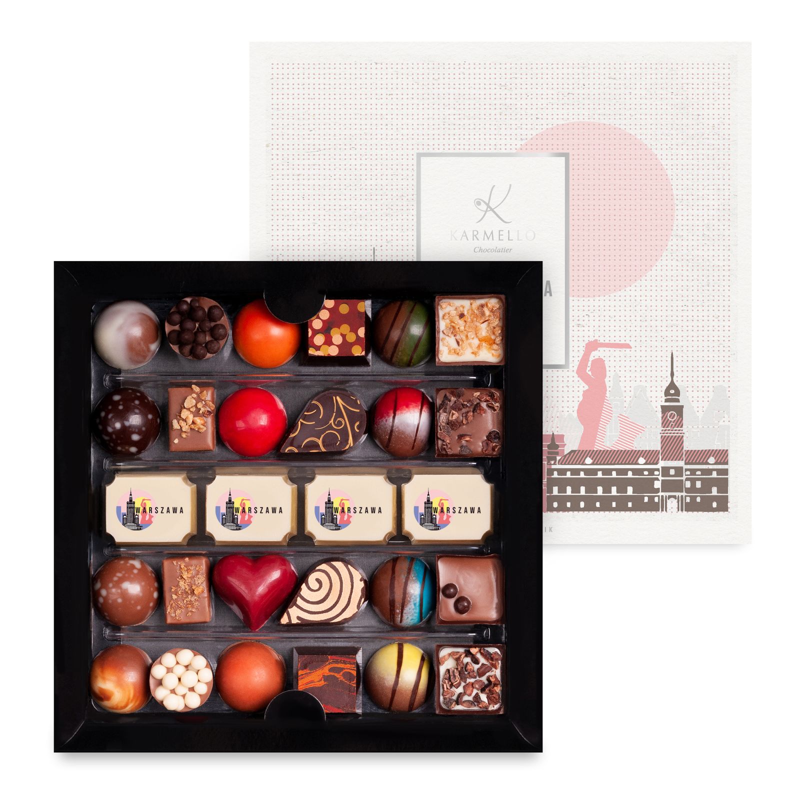 Karmello Standard ist eine Einladung in die magische Welt von Karmello Chocolatier. Ein Set von Schokostücken, die so komponiert sind, dass sie die herausragendsten Geschmacksrichtungen unserer Produkte präsentieren, angefangen von dezenten Nussnoten bis hin zu starken alkoholischen Aromen. Das Produkt ist sowohl optisch als auch geschmacklich ansprechend. Das Set enthält zusätzlich ein Bändchen „WARSZAWA“.