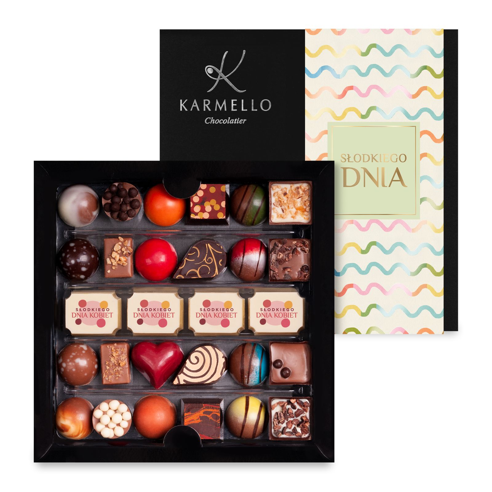 Tauche ein in eine süße Welt mit unserer besonderen Karmello Standard Kollektion, die speziell für den Frauentag zusammengestellt wurde! Wir bieten einzigartige Geschmacksrichtungen und besondere Verpackungen, die diesen Tag noch magischer und voller süßer Genussmomente machen. Das Set enthält zusätzlich Pralinen mit Anlassdruck sowie eine Banderole mit der Aufschrift „Süßen Tag“.