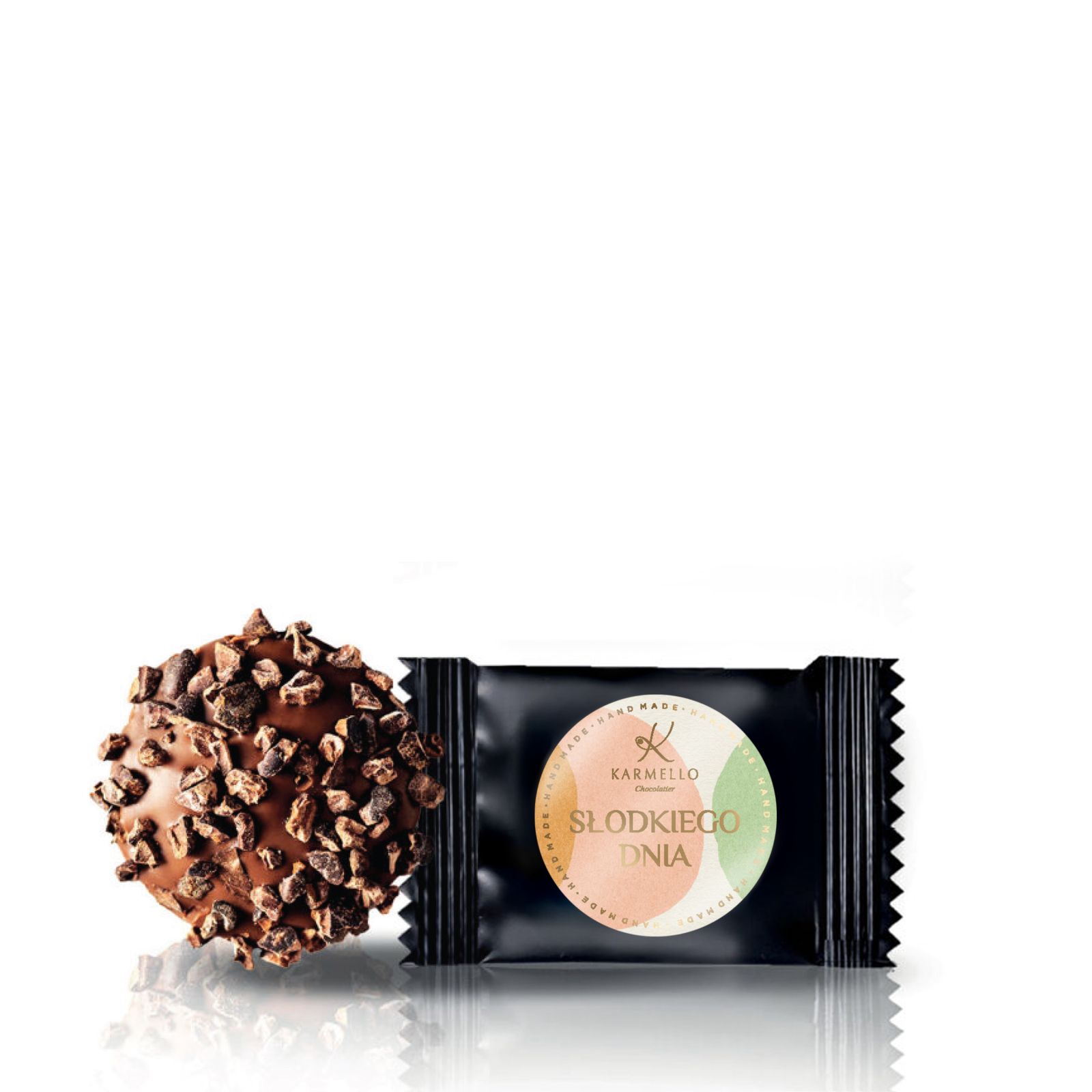 Ein Keks mit samtiger Mandelcremefüllung, überzogen mit köstlicher belgischer Schokolade. Das Ganze ist mit zerstoßenen, gerösteten Kakaonibs bestreut, die für einen angenehmen Crunch sorgen und die Tiefe des Schokoladengeschmacks hervorheben. Der Keks ist mit einem Sticker mit der Aufschrift „Süßen Tag“ verziert, der ihm einen warmen, geschenkartigen Charakter verleiht.