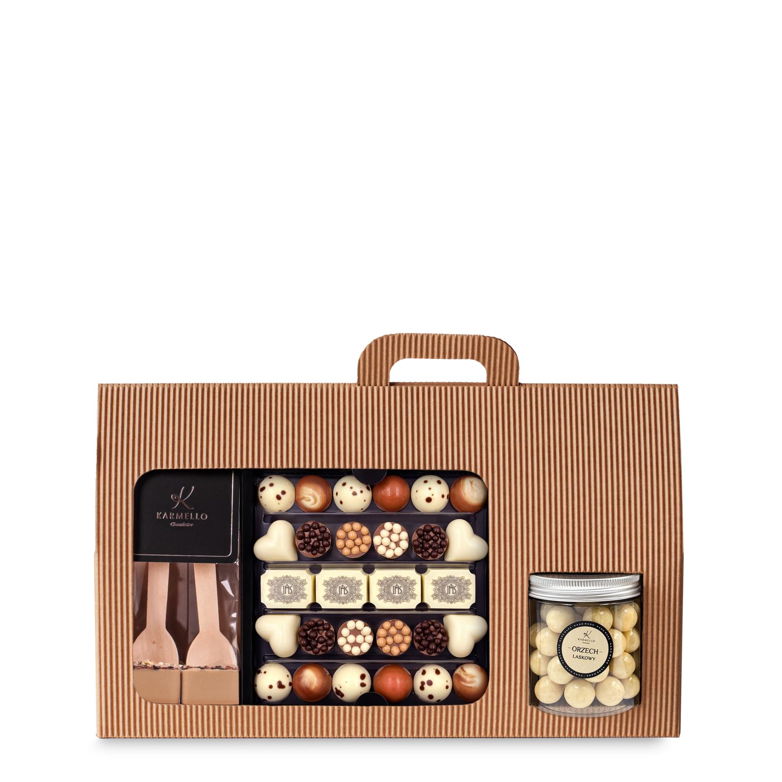 Die Kommunions-Umhängetasche ist eine Komposition, die anlässlich der Erstkommunion geschaffen wurde. Das Set verfügt über ein Sichtfenster, durch das alle Köstlichkeiten sichtbar sind, was diesem Geschenk einen besonderen Charakter verleiht. Dieses Set ist eine kleine Reise durch die Geschmackswelt – von samtiger Schokolade über leichte fruchtige Noten bis hin zu angenehm knusprigen Akzenten. Im Inneren befinden sich sorgfältig ausgewählte Süßigkeiten, die mit ihrer Vielfalt, Qualität und Liebe zum Detail überraschen, sodass jeder Bissen ein wenig anders schmeckt.