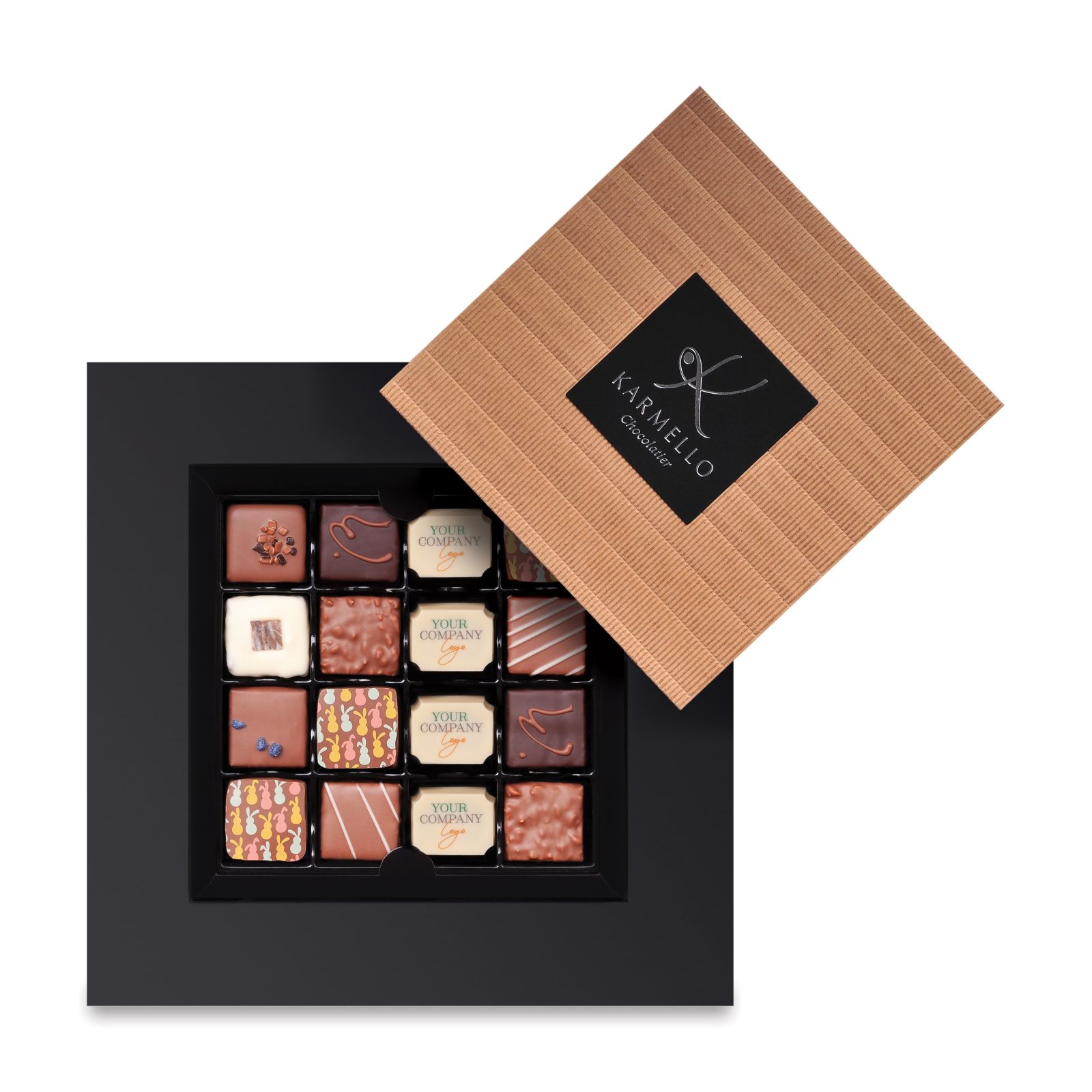 KW19/22 COLLECTION OF 16 PRALINES WITH A LOGO IN A FRAMED BOX
