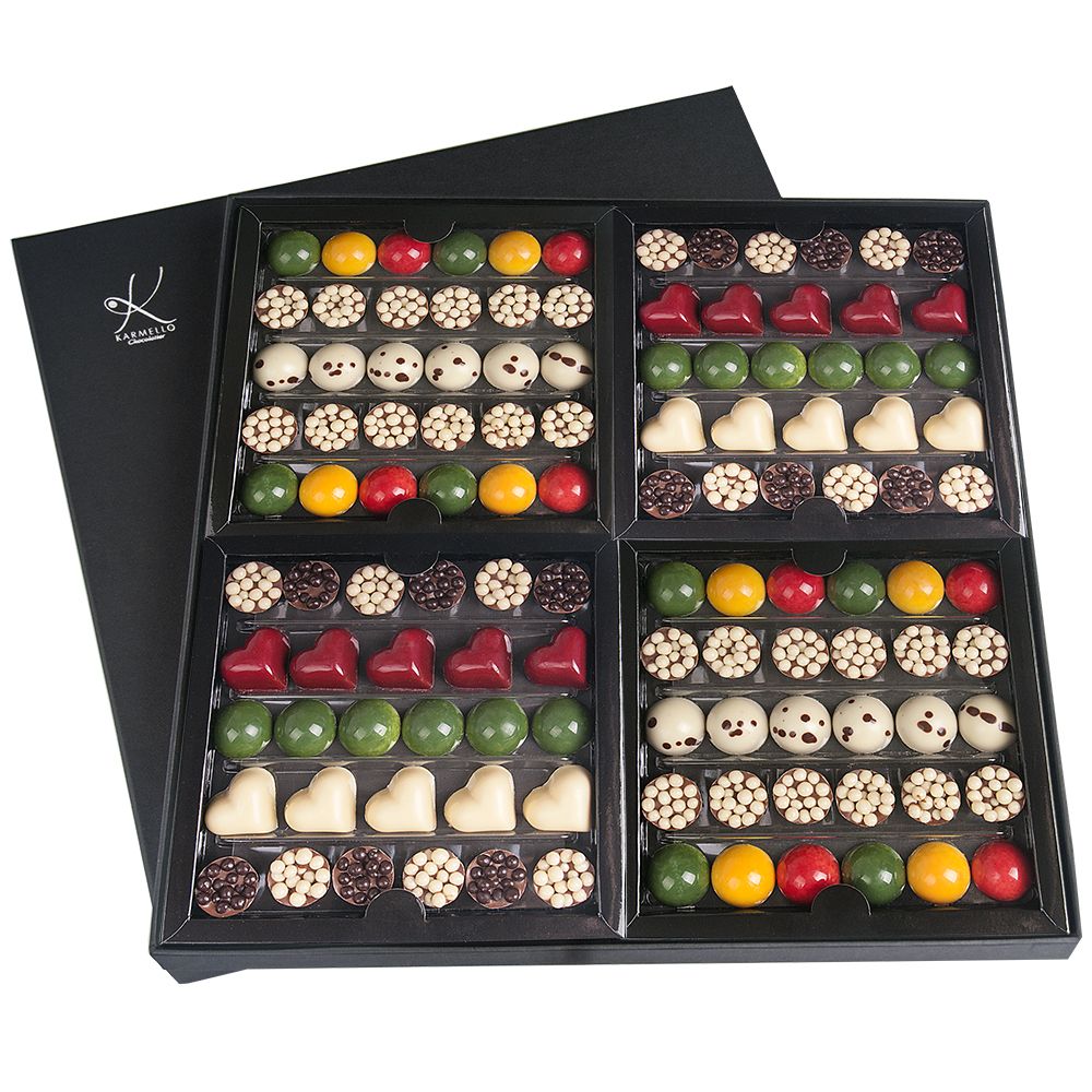Die Pralinen werden in vier separate Schachteln gelegt, die in einer eleganten Verpackung gesammelt werden - damit Sie sie alle oder jede Schachtel einzeln genießen können.