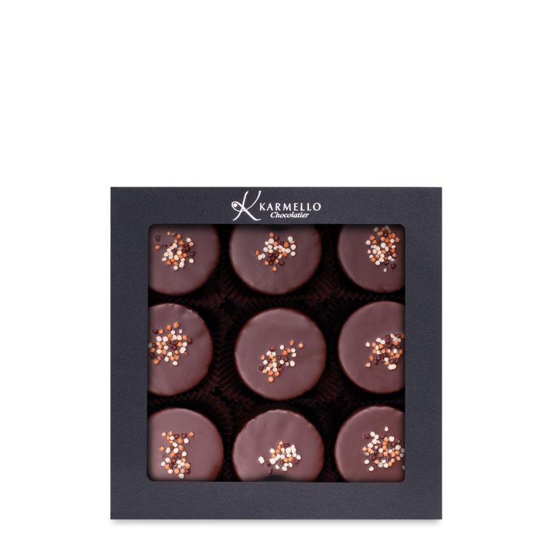 Finansjerki sind zarte Kekse mit einer einzigartigen Konsistenz und einem einzigartigen Aroma. Das Geheimnis ihres hervorragenden Geschmacks liegt im perfekten Backen, wodurch die Kekse innen weich, locker und saftig und außen gleichzeitig zart und knusprig sind. Im Gegensatz zu klassischen Weizenbackwaren werden Finanserki aus Mandel-, Pistazien- oder Haselnussmehl gebacken. Unsere Financiers sind mit perfekter belgischer Schokolade überzogen und mit sorgfältig ausgewählten Nüssen belegt.