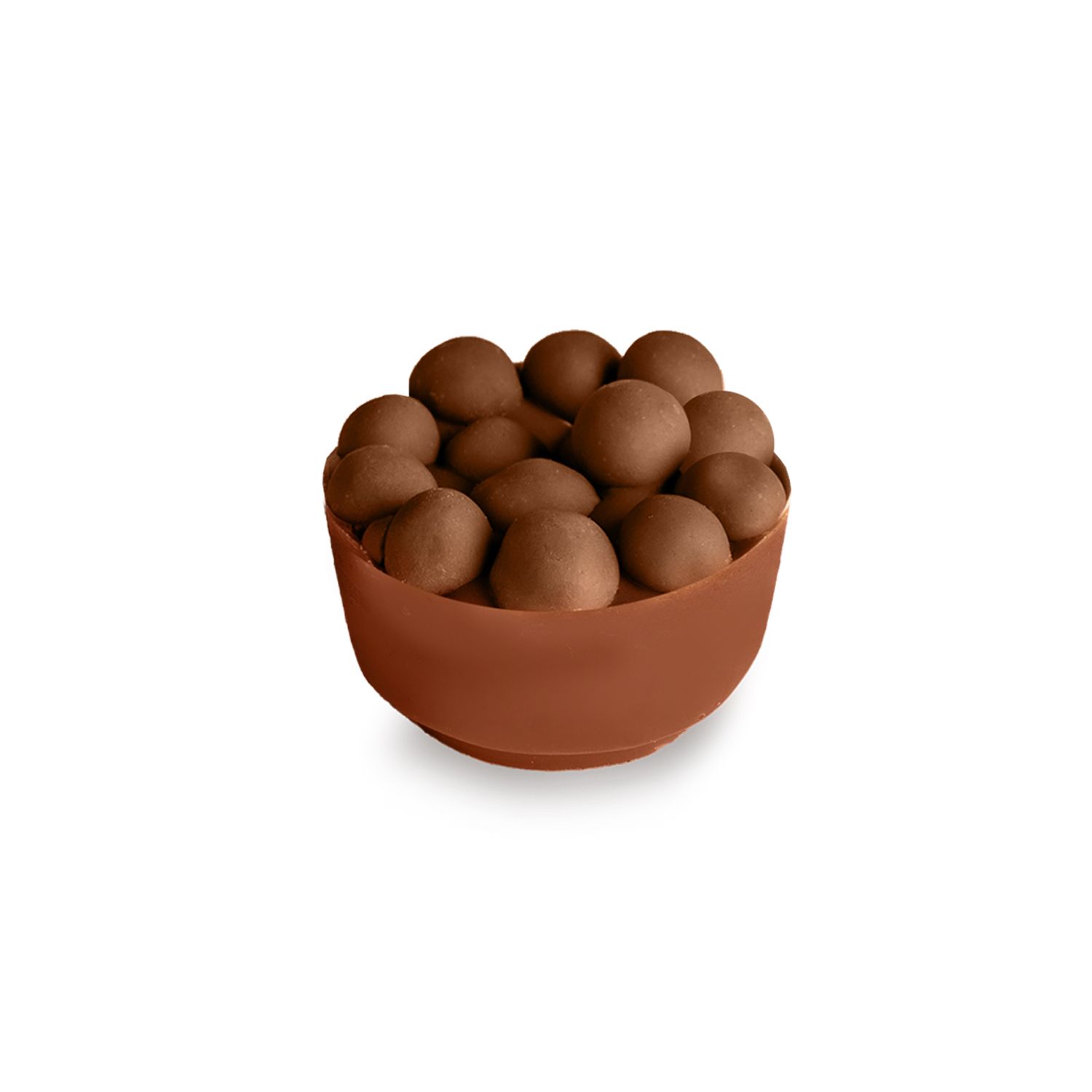 Becher mit Gianduja-Füllung, dekoriert mit knusprigen Perlen in Vollmilchschokolade.
