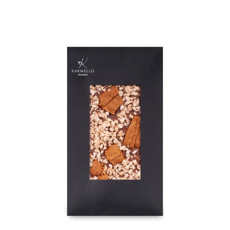 Eine Platte aus köstlicher belgischer Milchschokolade, dekoriert mit Apfelstückchen, die mit Zimt und würzigen Keksen bestreut sind. Ein ideales Angebot für Liebhaber origineller Aromen.