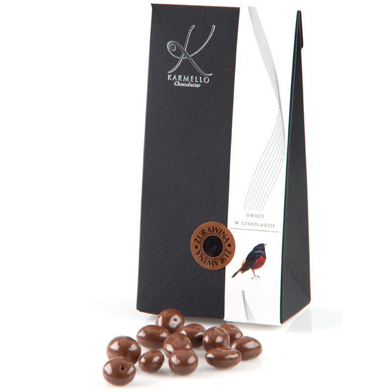 Herbe Früchte von getrockneten Moosbeeren, umgeben von zarter Milchschokolade.