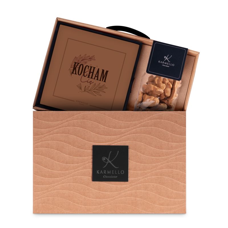 Die Kombination aus Schokolade mit dem Aufdruck „I love you“ und einem Karamell-Cluster ist die perfekte Geschenkidee für einen lieben Menschen. Alles in einer eleganten Verpackung.