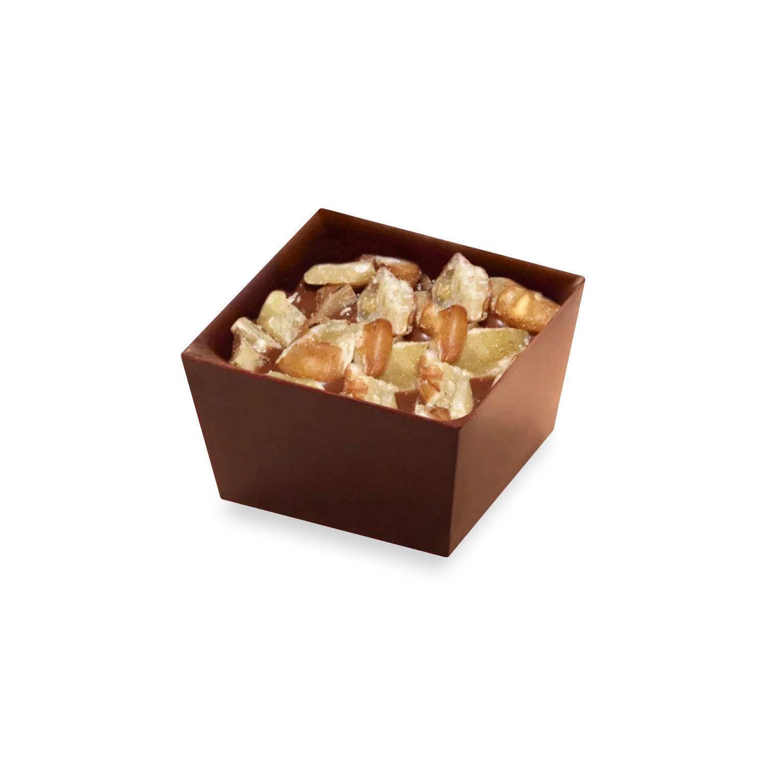 Eine harmonische Komposition aus Vollmilchschokolade und Honig, garniert mit Walnüssen.