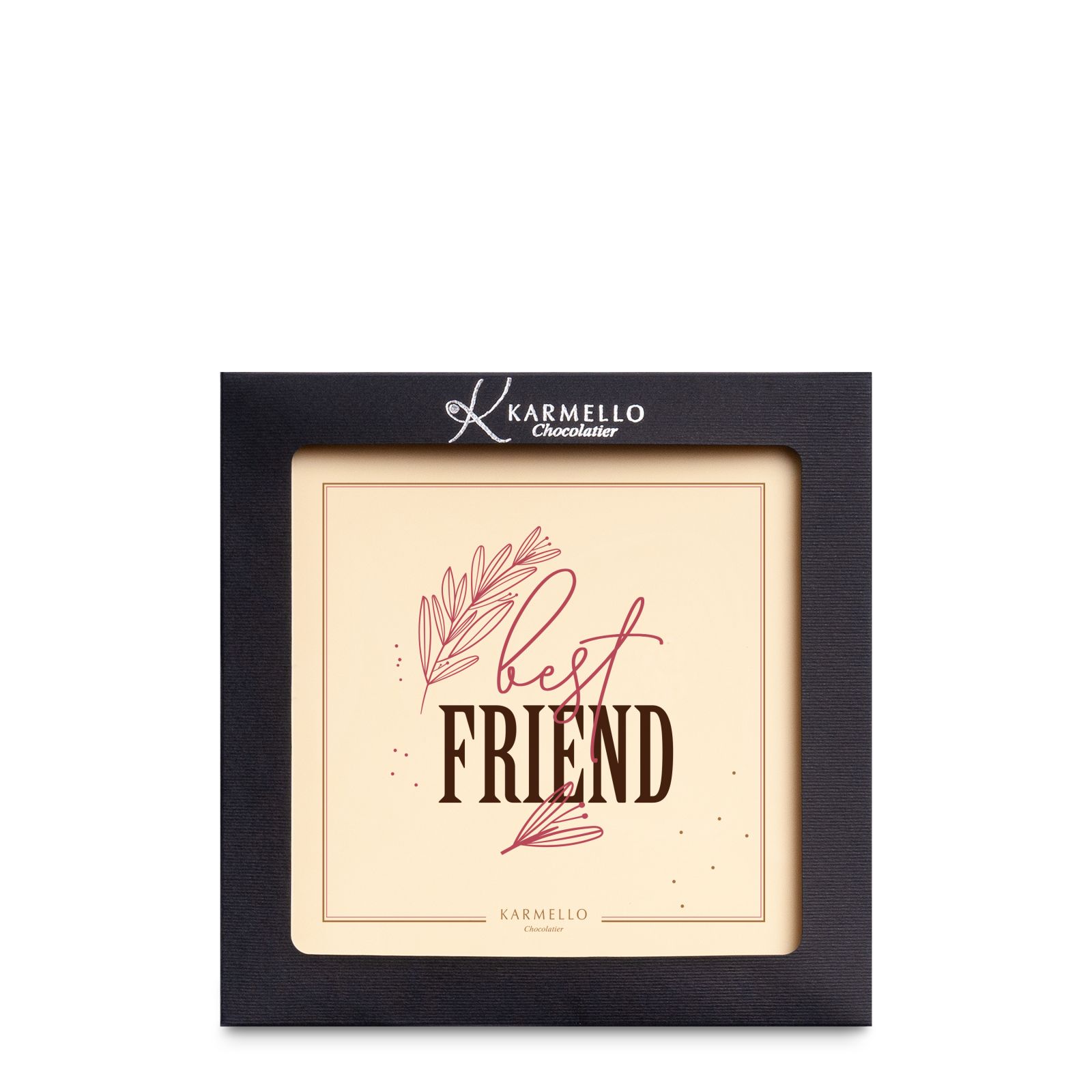 Das belgische, weiße Schokoladenblech verziert mit dem Bekenntnis „Best Friend“. Schokolade eignet sich perfekt als süßes Geschenk