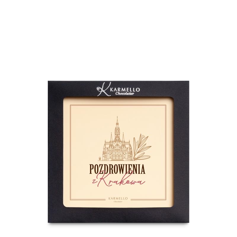 Das belgische, weiße Schokoladenblatt verziert mit dem Bekenntnis von „Pozdrowienia z Krakowa“. Schokolade eignet sich perfekt als süßes Geschenk
