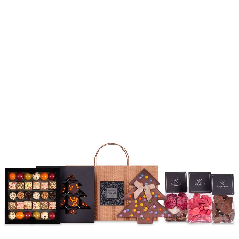Ein Set für ein Weihnachtsgeschenk, das für jeden Liebhaber von Süßigkeiten perfekt ist. Die Komposition besteht unter anderem aus einer Weihnachtskollektion aus Pralinen, Fruzzels, Clustern und einem Blatt belgischer Schokolade in Form eines Weihnachtsbaums. Verpackt ist das Ganze in einer eleganten beigen Tasche. Im Set ist auch ein Etikett mit der Aufschrift „Frohe Weihnachten“ enthalten, wodurch die Komposition als Weihnachtsgeschenk einen einzigartigen Charakter erhält.