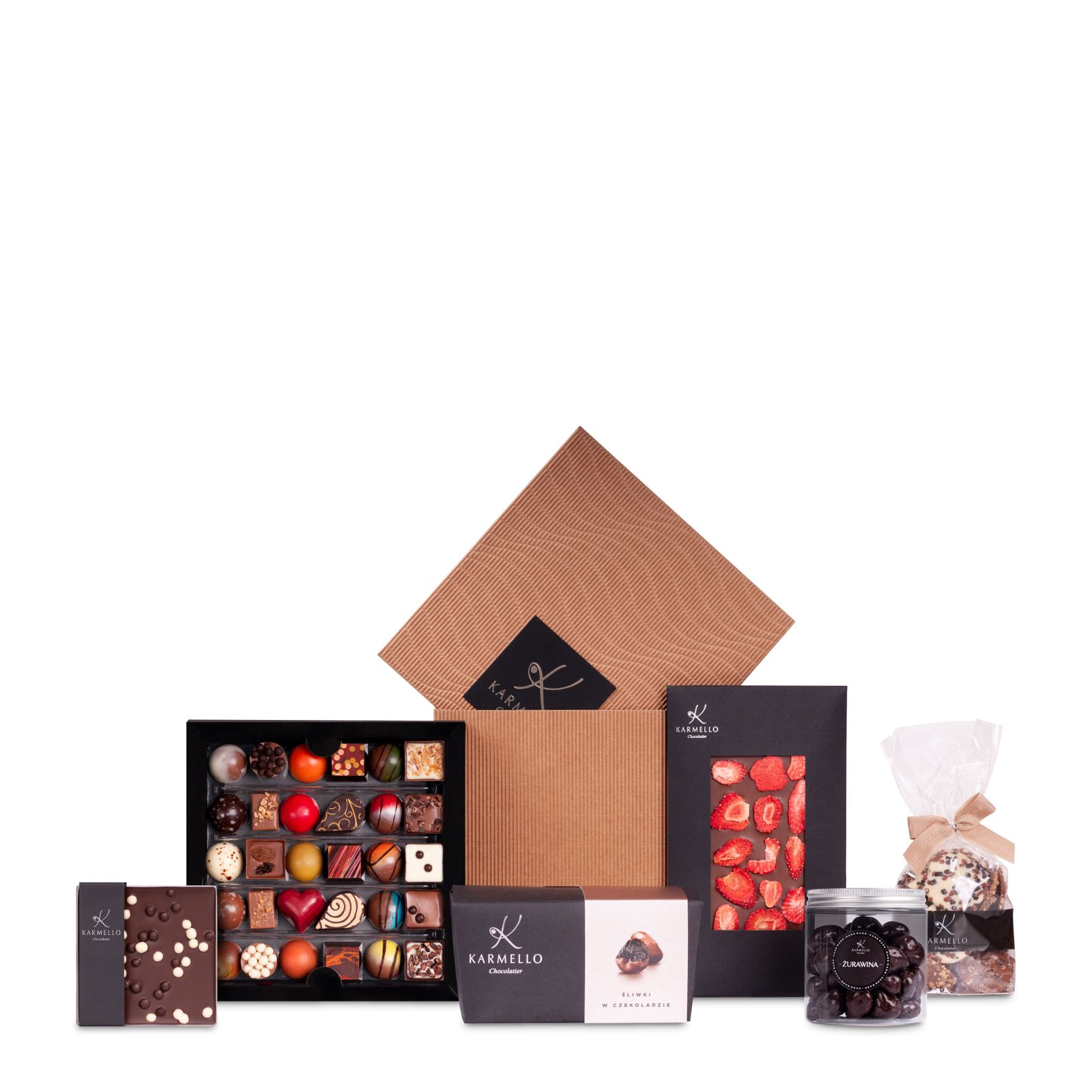 Die äußerst klassische Linienführung der eleganten Verpackung, die bis zum Rand mit schokoladiger Perfektion von Karmello gefüllt ist, ist ein Rezept für ein ideales Geschenk für einen lieben Menschen. Das Set besteht aus sorgfältig zusammengestellten Produkten, die einen Querschnitt durch unser Angebot darstellen und dem Beschenkten eine süße Reise durch die magischen Geschmäcke von Karmello Chcolatier ermöglichen.