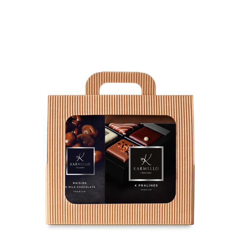 Ein perfektes Duo für Liebhaber klassischer Genüsse. Das Set enthält vier Pralinen in verschiedenen Geschmacksrichtungen und schokoladenüberzogene Rosinen – eine Kombination, die durch ihre Schlichtheit und Harmonie begeistert. Ein elegantes, süßes Geschenk, das jederzeit Freude bereitet.