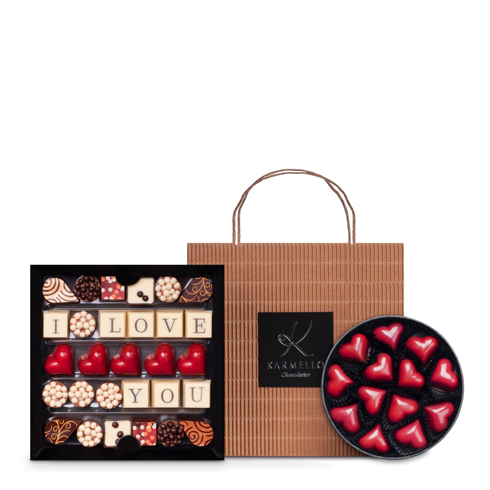 A perfect duo for a gift for a Woman - a set of chocolates decorated with the "I love you" band and caramel-flavored hearts in a round box tied with a red ribbon. Everything is packed in an elegant, beige bag.