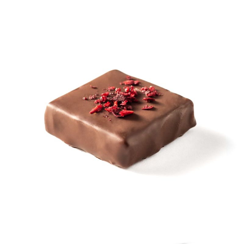 Der Geschmack von Alkohol kombiniert mit Milchschokolade. Alles mit Zartbitterschokolade überzogen und mit Stücken von gefriergetrockneten Kirschen dekoriert.