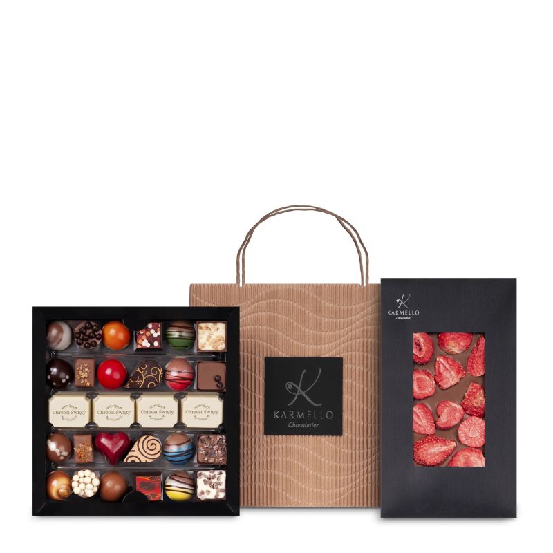 Eine perfekte Kombination für ein süßes Geschenk - eine Pralinenkollektion mit gelegentlichem Aufdruck auf den Pralinen und Schokolade mit Erdbeeren. Produkte verpackt in einer eleganten beigefarbenen Tasche.