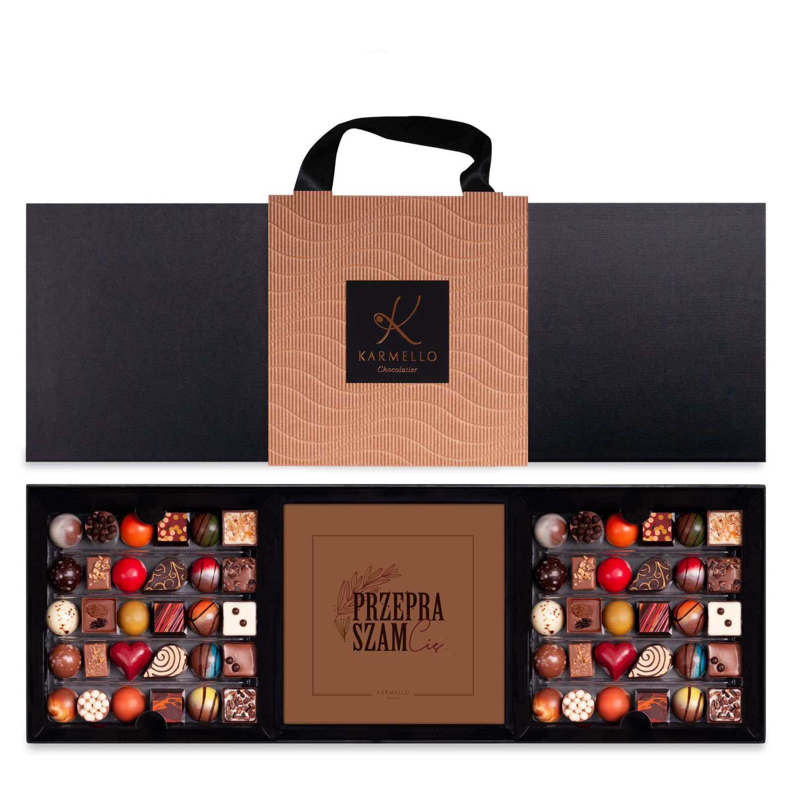 Eine Kombination aus der meistverkauften Karmello Standard Collection mit Schokolade und gelegentlichem „Es tut mir leid“-Aufdruck in einer Verpackung. Ein braunes Band erleichtert das Verschenken.