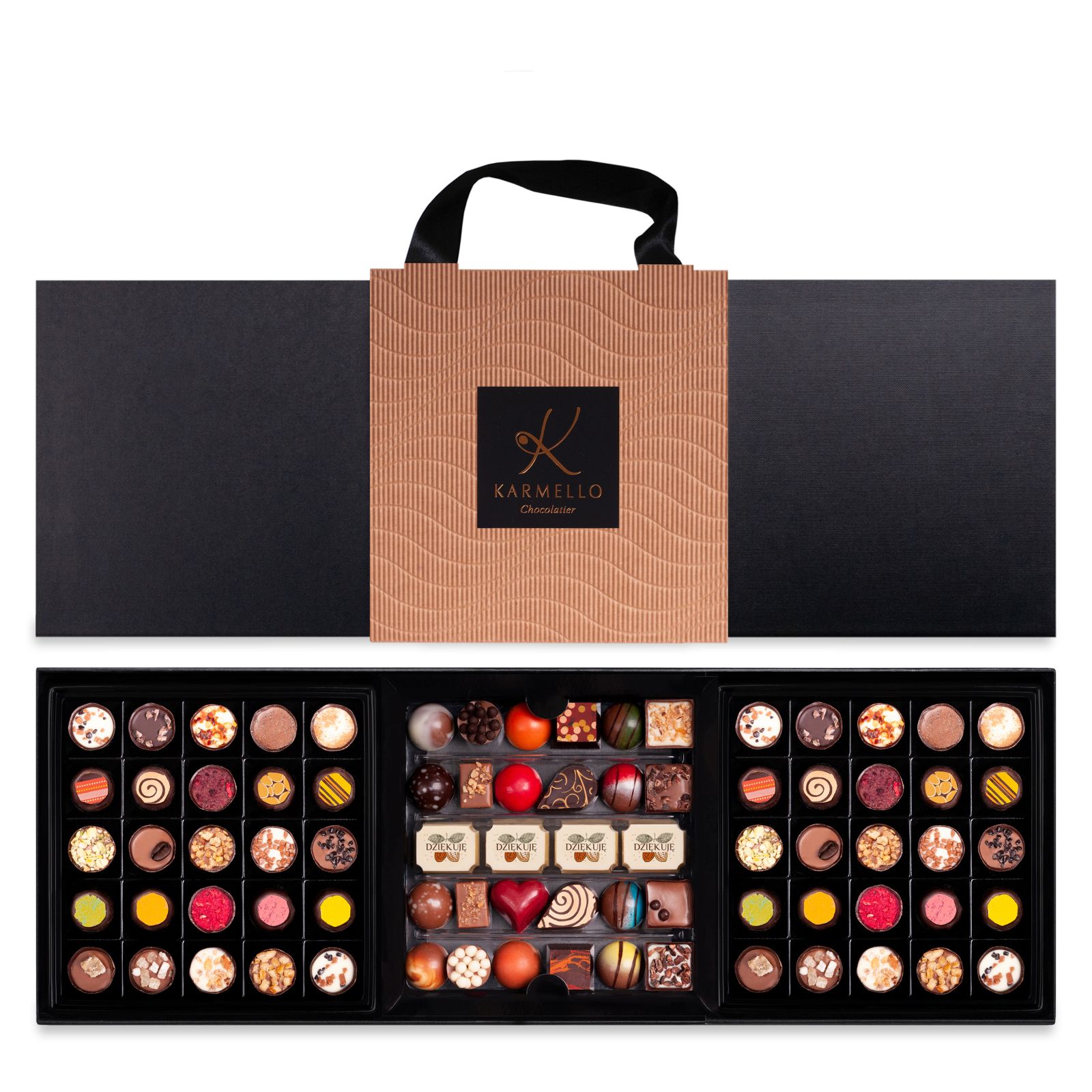 Neue Verpackung von Karmello! Kombination der Karmello Chocolate Collection, der Exclusive Chocolate Collection und der Truffle Collection in einem Paket. Die perfekte Komposition für ein Geschenk für Jedermann - ein braunes Band erleichtert das Schenken.