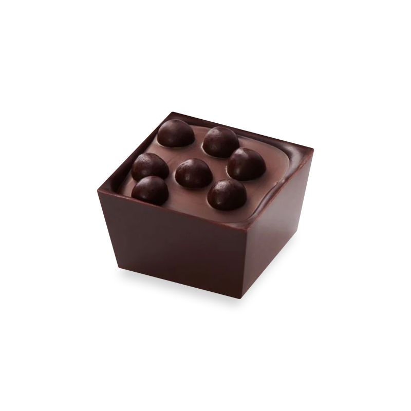 Dunkle Füllung mit aromatischem Orangenlikör unter einer Schicht aus Vollmilchschokolade und knusprigen Perlen.
