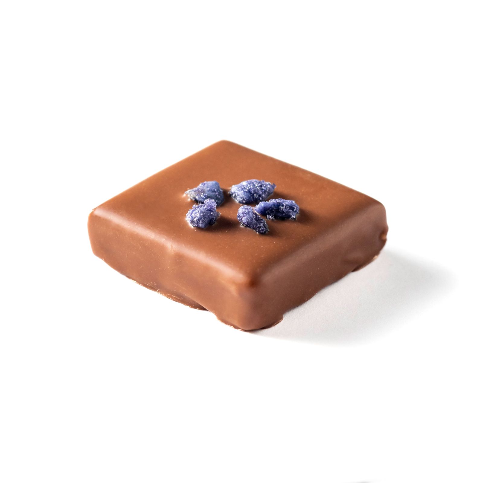 Eine überraschende Kombination aus zarter Milchschokolade und Veilchen, umhüllt von Milchschokolade.