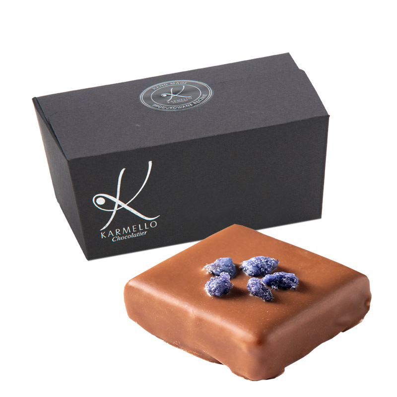 Eine überraschende Kombination aus zarter Milchschokolade und Veilchen, umhüllt von Milchschokolade.