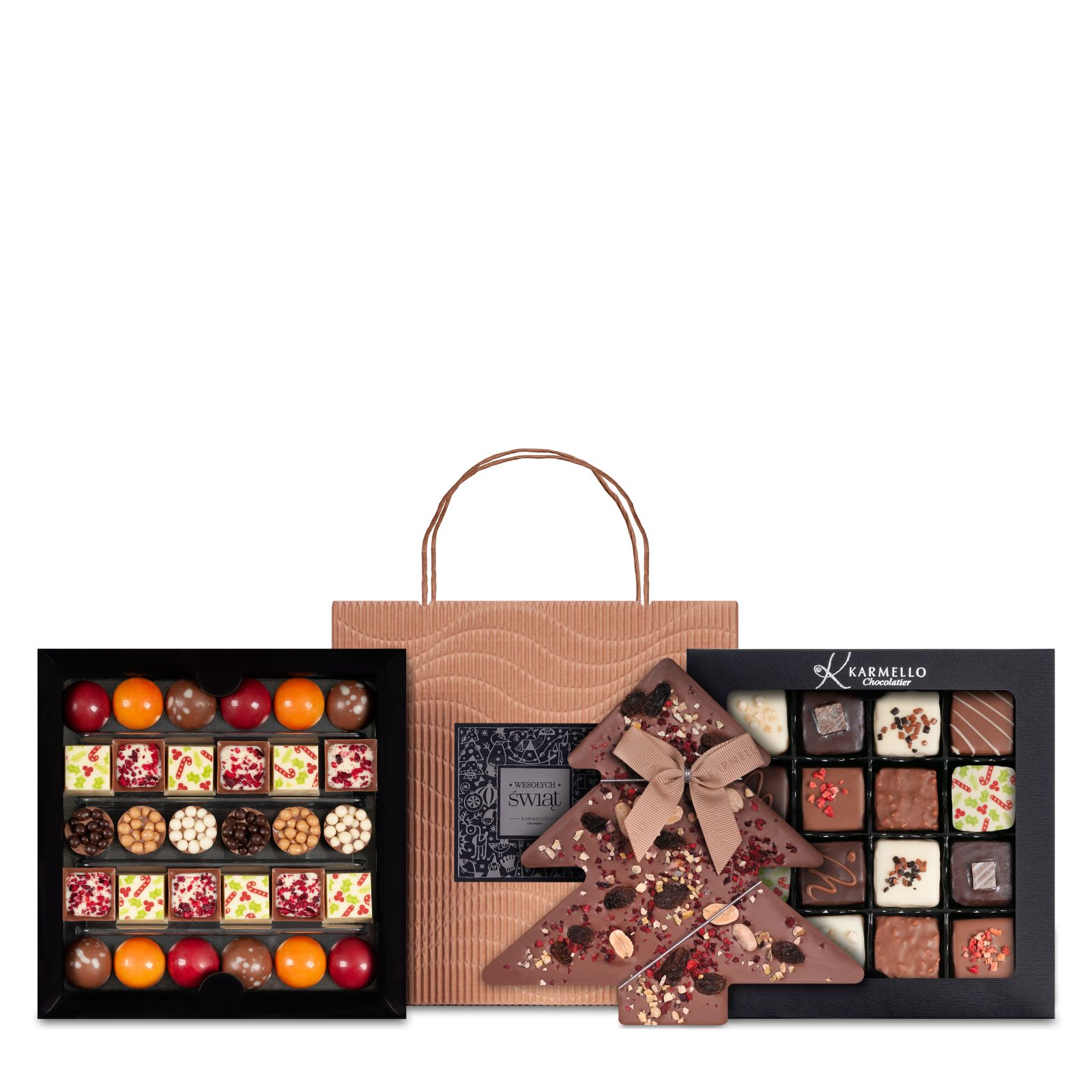Ein Blatt belgische Schokolade in Form eines Weihnachtsbaums, eine Sammlung von 16 Weihnachtspralinen und ein Weihnachtspralinenset – eine Kombination, die jeden begeistern wird. Verpackt sind die Produkte in einer eleganten, beigen Tasche. Das Ganze ist ein perfektes Weihnachtsgeschenk. Im Set ist auch ein Etikett mit der Aufschrift „Frohe Weihnachten“ enthalten, wodurch die Komposition als Weihnachtsgeschenk einen einzigartigen Charakter erhält.