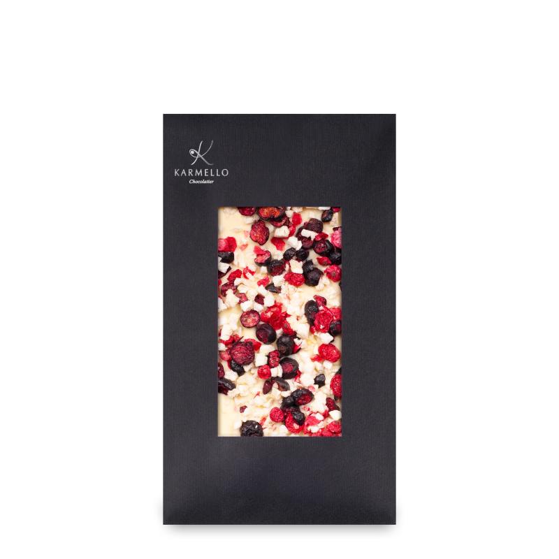 Eine Platte aus köstlicher belgischer weißer Schokolade, dekoriert mit gefriergetrockneten Äpfeln und Johannisbeeren. Ein ideales Angebot für Liebhaber origineller Aromen.