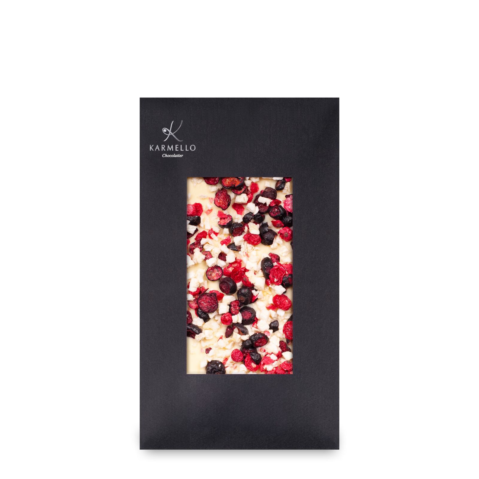 Ingredients: white chocolate (sugar; cocoa butter; whole MILK powder; emulsifier: SOYA lecithin; natural vanilla flavouring); freeze-dried redcurrants and blackcurrants; freeze-dried apples.