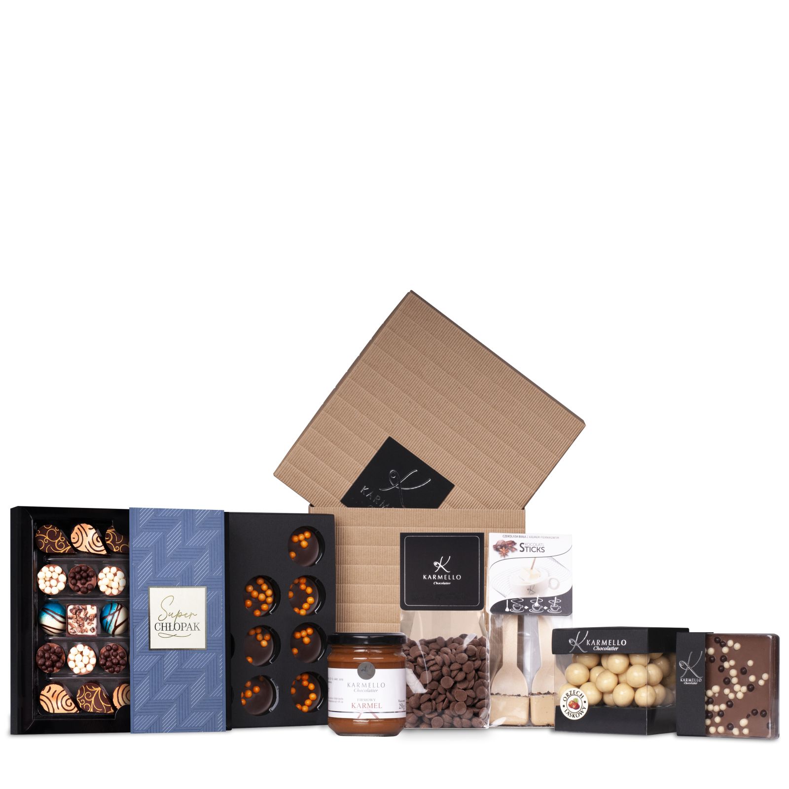 Ein ungewöhnliches Geschenk für einen Jungen. Jeder findet etwas für sich, von handgemachten Pralinen, Streuseln bis hin zu Sahne und Nüssen, die mit köstlicher belgischer Schokolade überzogen sind. Alles ist in einer eleganten, kubischen, beigen Verpackung verpackt.